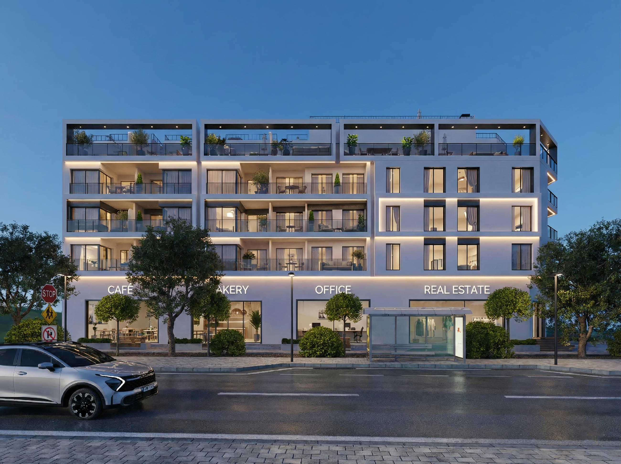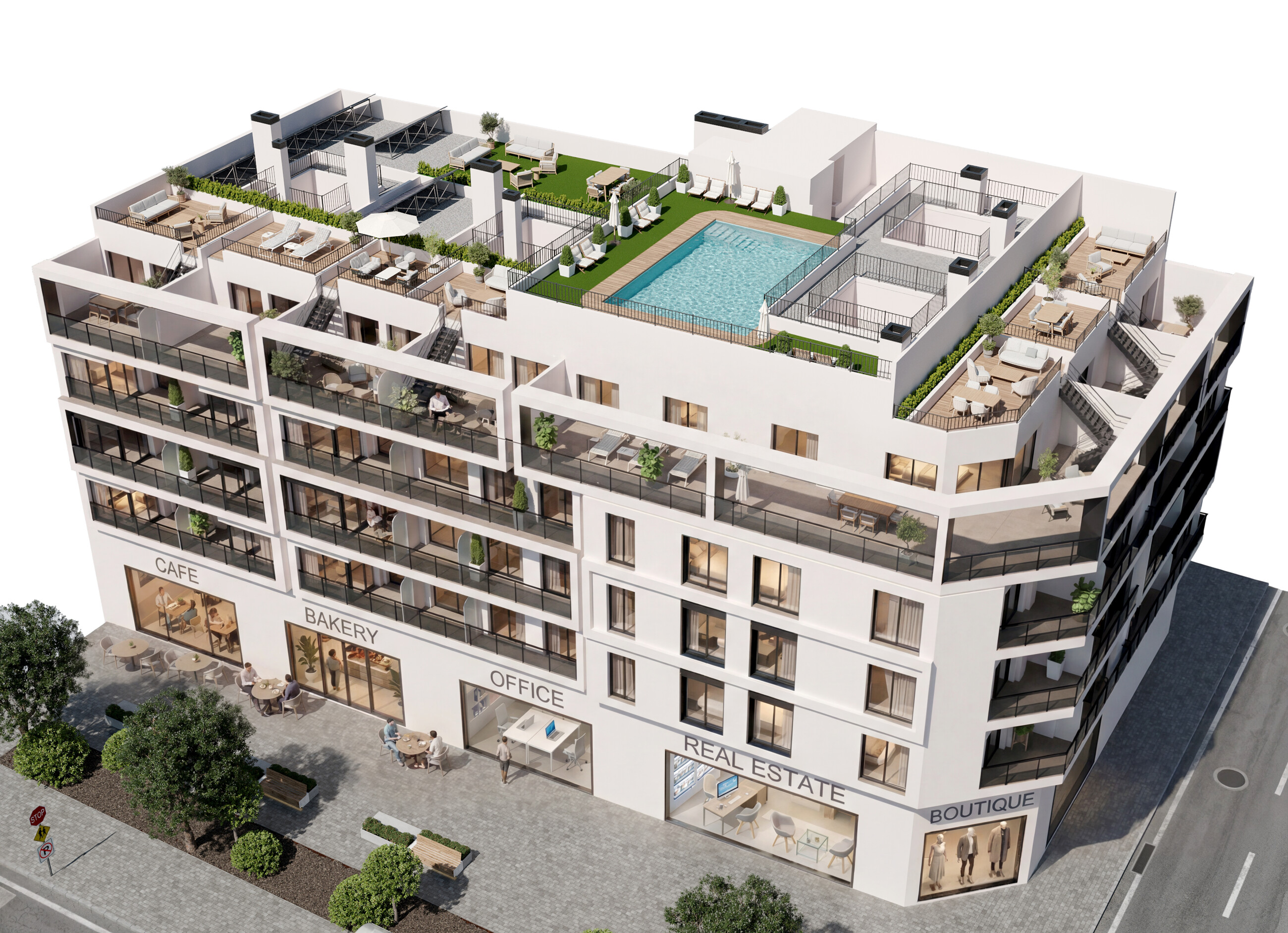 Byggnaden rymmer totalt 34 lägenheter fördelade över flera våningar, alla med högkvalitativa ytskikt och genomtänkt planlösning. På bottenvåningen finns en kommersiell lokal, och det erbjuds även 32 garageplatser och 20 förråd som tillval.